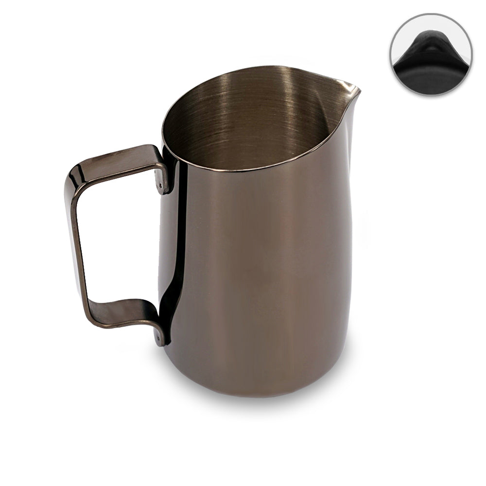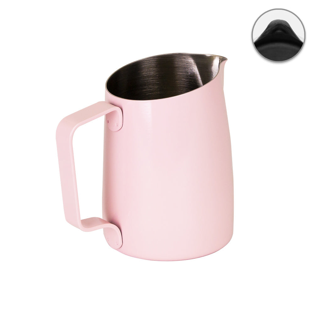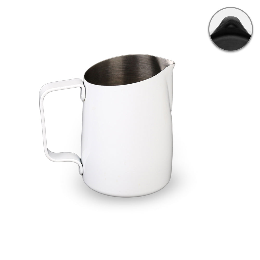 Introducing our classic round spout milk pitcher with a slanted top , designed for a faster pour and ideal for creating wave patterns with softer, rounded lines.