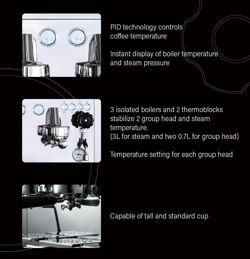 1 boiler and thermoblock for each group head Isolated boiler for steam wand (3 independent boilers and 2 thermoblocks in total) |