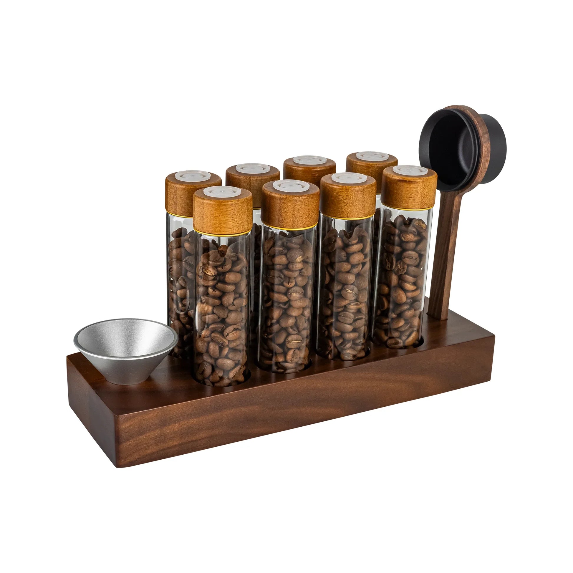 Store and organise your coffee beans in style with this compact bean storage unit. Featuring a solid walnut wood base and 8 glass tubes, each equipped with a one-way valve for CO2 release, it ensures your beans stay fresh while degassing. Each tube holds up to 20g of coffee, perfect for single servings or precise brewing. The set includes a handy funnel and coffee spoon, making it easy to fill the tubes without spills. A must-have for coffee enthusiasts who value freshness, functionality, and timeless design.